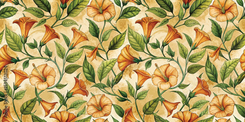 © Skyqun, Naklejka premium Vibrant orange flowers with lush green leaves on a textured beige background.