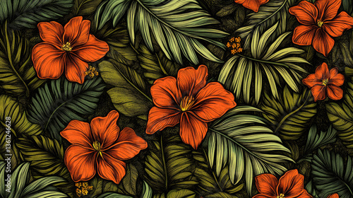 © EnelEva, Naklejka premium Vibrant orange flowers with lush green leaves pattern