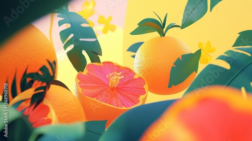 © novanda, Naklejka premium Vibrant orange fruits, tropical leaves, and flowers in a stylized 3D composition