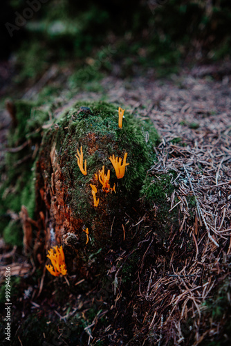 Obraz premium Vibrant orange fungi emerging from a moss-covered log in a tranquil forest...