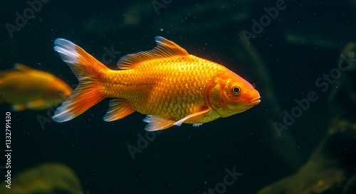 Fototapeta premium Vibrant Orange Goldfish in Dark Water - A single, bright orange goldfish swims in dark water, its fins elegantly spread. A blurry goldfish is visible in the background
