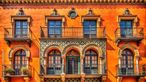 © Man888, Fototapeta premium Vibrant orange-hued stucco facade adorned with ornate wrought iron balconies, arched windows, and Moorish-inspired tile work in a sun-kissed setting.