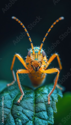 Fototapeta premium Vibrant orange insect perched on a leaf, macro photography.