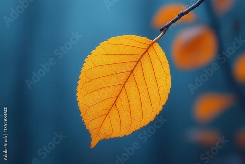 © Shipra, Obraz premium Vibrant orange leaf hanging from branch against a soft blue background in early autumn setting