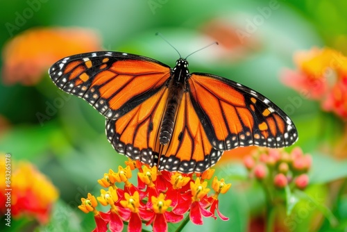 Fototapeta premium Vibrant orange monarch butterfly on red and yellow flower