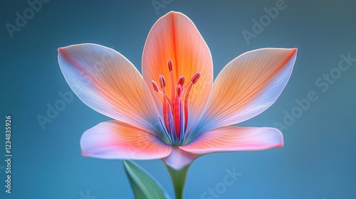© AFFANYUDA, Fototapeta premium Vibrant orange-pink lily flower close-up on soft teal background