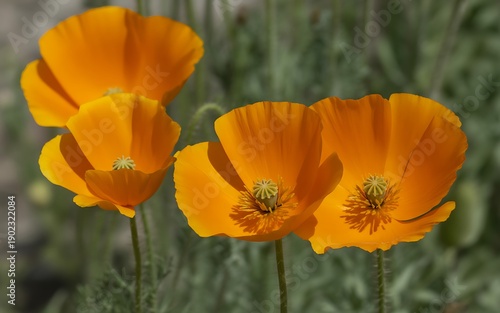 © IT'S ORA, Fototapeta premium Vibrant orange poppies blooming in sunny garden with green stems