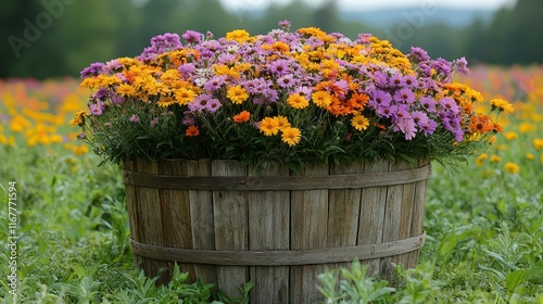 © Pc, Fototapeta premium Vibrant orange, purple, and yellow flowers in a rustic wooden barrel, set against a field of blossoms.