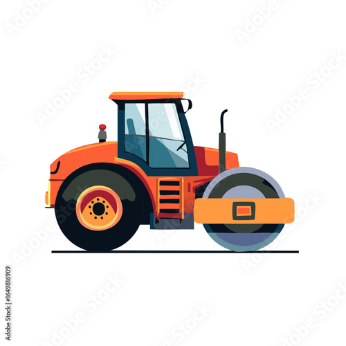 © FryArt, Naklejka premium Vibrant Orange Road Roller With Heavy Compaction Drum for Construction Projects