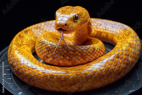 © Borasca, Obraz premium Vibrant orange snake coiled with tongue flicking on dark background