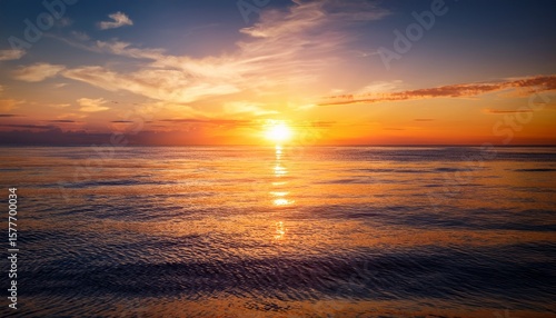 Naklejka premium vibrant orange sunset over gentle ocean waters reflecting sunlight in serene scene