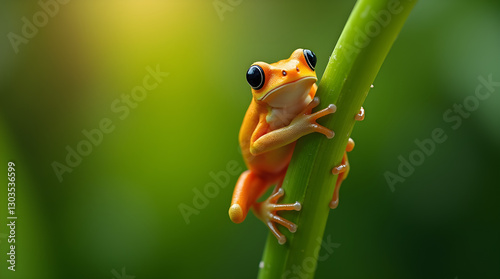 Obraz premium Vibrant Orange Tree Frog Climbing Green Stem - Macro Close-Up Wildlife Nature...