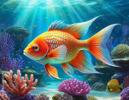 © Julija, Fototapeta premium Vibrant orange white yellow blue red reef fish swim through coral reef. Sun rays pierce sea water. Variety of animal. Ecology hydrosphere. Anthropogenic factor influencing death of coral reefs. AI