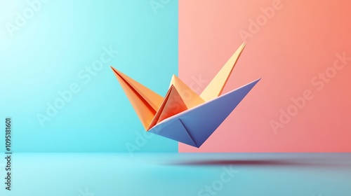 © Darunee, Naklejka premium Vibrant Origami Masterpiece: Colorful 3D Paper Sculpture Floating in Serene Space