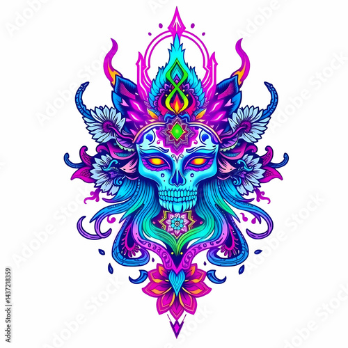 Fototapeta premium Vibrant Ornamental Tattoo Print – Neon Glow, Mystical Symbolism, Retro...