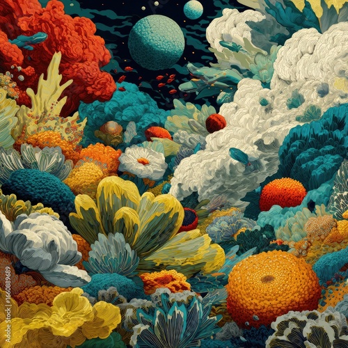 Naklejka premium Vibrant, otherworldly coral reef scene with planets