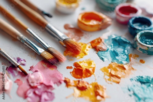 © Alina, Obraz premium Vibrant paint colors and brushes on an artist's palette