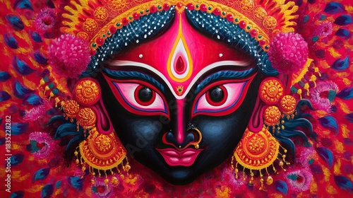 Naklejka premium Vibrant painting of a hindu goddess face with a third eye and traditional...