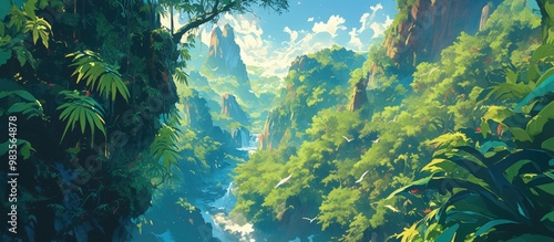 Fototapeta premium Vibrant painting of giant ferns amidst cliffs and valleys featuring lush vines and bushes ideal for backgrounds or wallpapers and suitable for web banner designs