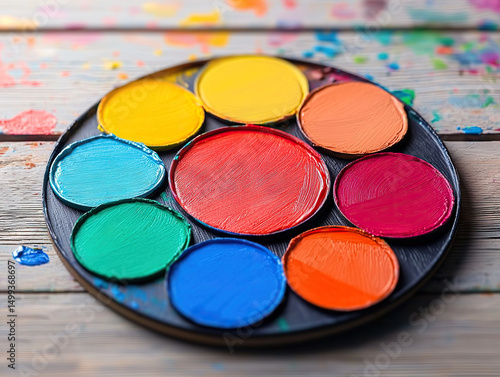 Naklejka premium Vibrant palette of colorful paints on wooden surface, evoking creativity and artistic expression