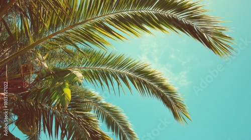 © Tanu, Fototapeta premium Vibrant palm tree leaves reaching towards a clear sky on a sunny day in a tropical setting