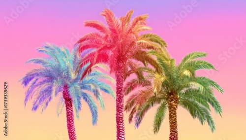 Naklejka premium Vibrant palm trees silhouetted against a colorful gradient sky of pink,...