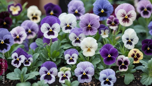 Fototapeta premium Vibrant pansy flowers in bloom showcasing a beautiful array of purple and white petals in a lush garden setting.