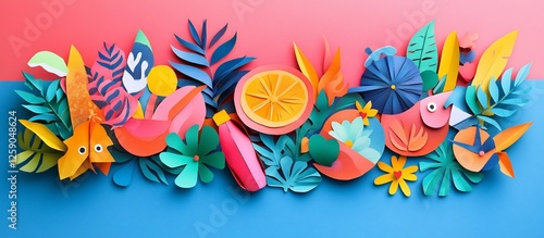 Fototapeta premium Vibrant paper cut-out artwork featuring tropical elements and flowers against...