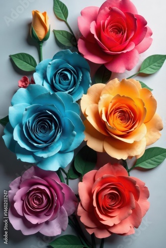 © Kathy, Obraz premium Vibrant paper roses in diverse hues form a textured backdrop, stationery, multicolored