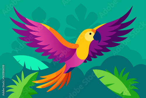 Obraz premium Vibrant parrot in flight amidst lush tropical foliage