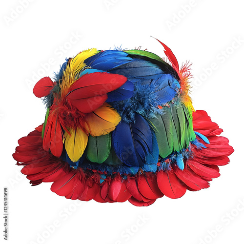 © vanilnilnilla, Obraz premium Vibrant Parrot-Inspired Feathered Cap Accessory on Clean White Background