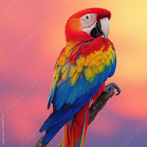 © LOMOSONIC, Obraz premium Vibrant Parrot Perched on Branch at Sunset Pink Background