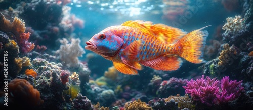 Fototapeta premium Vibrant parrotfish swimming amidst colorful coral reefs highlighting its...
