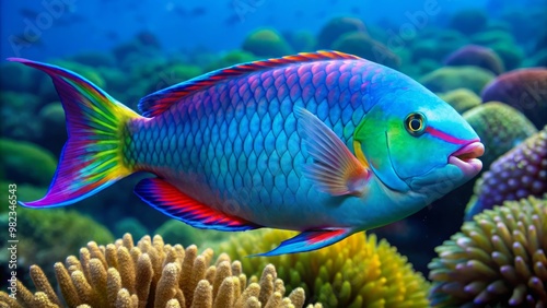 Fototapeta premium Vibrant parrotfish swims gracefully through the azure ocean depths showcasing...