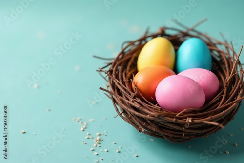 Fototapeta premium Vibrant pastel colored eggs in a decorative nest, showcasing an Easter...