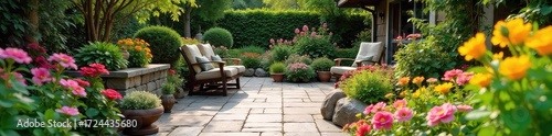 Obraz premium Vibrant patio garden overflowing with colorful flowers, lush greenery, and...