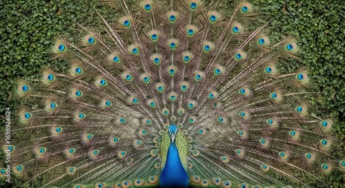 © Ulyana, Naklejka premium Vibrant peacock displaying magnificent feathers in lush greenery