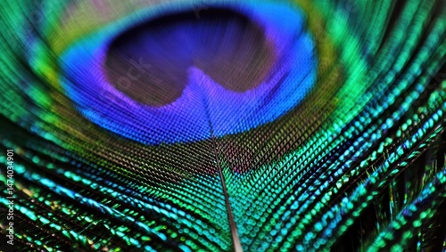 © IbragimovN, Naklejka premium Vibrant peacock feather close-up with iridescent blue and green patterns
