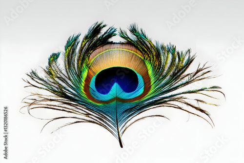 Fototapeta premium Vibrant Peacock Feather Displays Iridescent Colors Against White Background,...