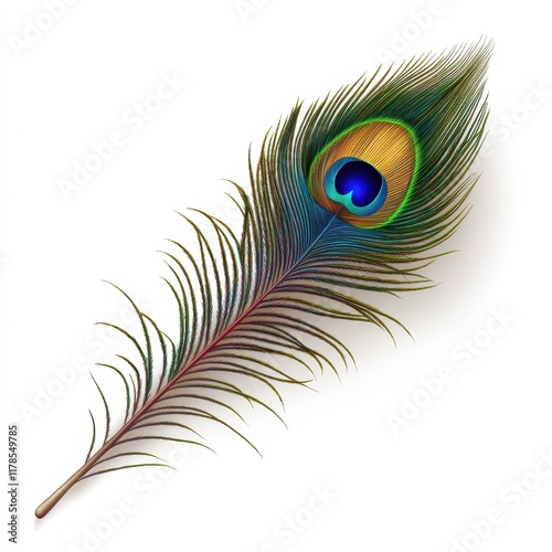 Fototapeta premium Vibrant peacock feather showcases intricate patterns on a clean white background