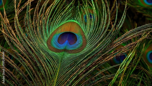 Fototapeta premium Vibrant peacock feather with detailed electric blue emerald green and golden...