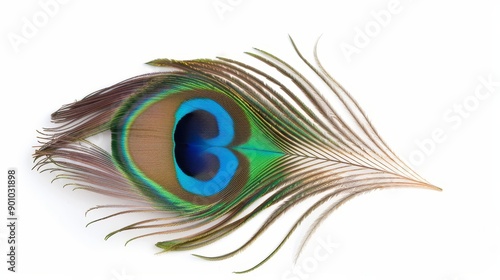 Obraz premium Vibrant peacock feather with eye pattern, isolated, blank background with...