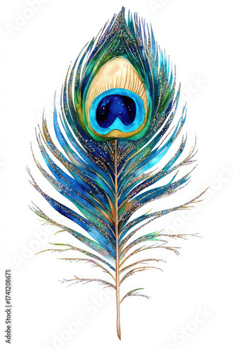 Fototapeta premium vibrant peacock feather with intricate details and shimmering colors, shades of blue and green against white background. This artwork captures beauty and elegance of nature