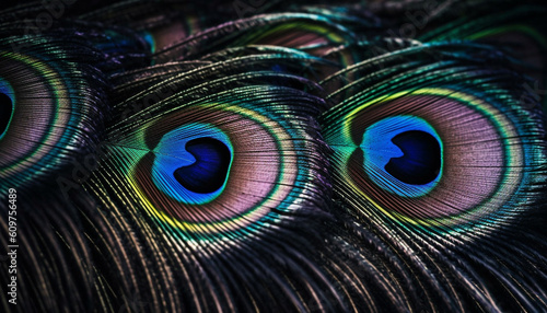 Naklejka premium Vibrant peacock feathers showcase beauty in nature multi colored patterns generated by AI