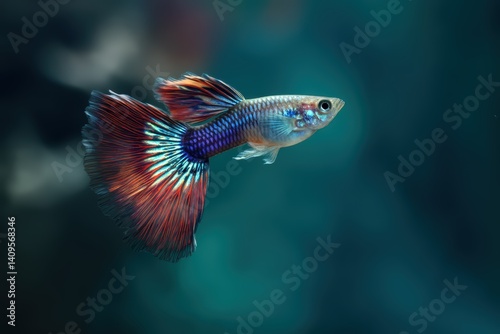 © RICH, Fototapeta premium Vibrant Peacock Guppy with Colorful Tail Fin Display in Deep Green Aquatic Setting.