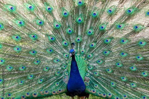 © Mk1974/Wirestock Creators, Fototapeta premium Vibrant peacock proudly flaunting its feathers in its zoo enclosure