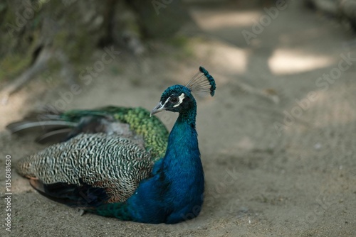 Fototapeta premium Vibrant peacock resting in natural setting.