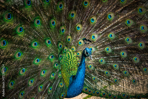 © Pedro, Fototapeta premium Vibrant Peacock Showing Iridescent Plumage