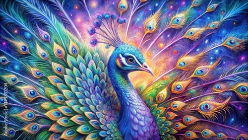 © Urenus Photos, Fototapeta premium Vibrant Peacock with iridescent plumage displaying a majestic tail in a cosmic, fantasy setting
