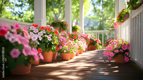 Fototapeta premium Vibrant Petunias in terracotta pots on a sunny porch